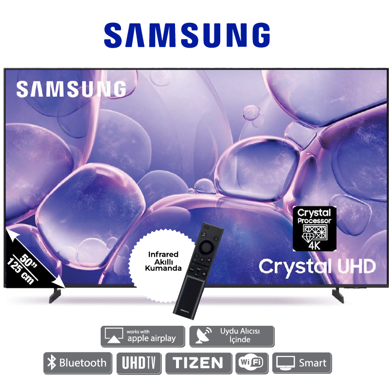3840×2160p 4K UHD çözünürlük, 50 Hz ekran yenileme hızı, Crystal UHD ekran teknolojisi, HDR10+ ve HLG desteği, 3×HDMI ve 1×USB bağlantı girişi, 2 kanallı 20W ses çıkışı, Q Symphony ve Adaptive Sound desteği, Crystal 4K işlemci, Tizen işletim sistemi, Screen Mirroring ve Smart TV özellikleri